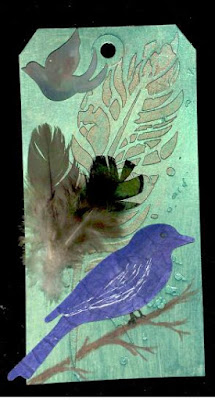 My tag has a distress inked background with a script stamped on top. I added an open weave fabric at the bottom with some leaf charms, and some die cut leaves in Autumn colours.
