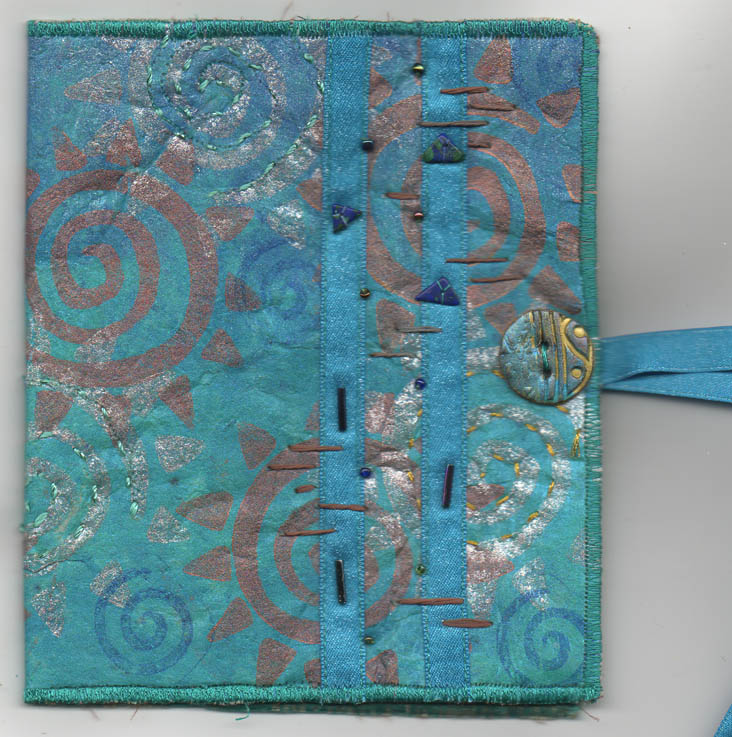Last week I was away with five friends on a Play Away. We had a fabuous time, and are doing it again next year. Each of us led a half day session, and the general theme was books. Annie showed us how to make silk paper, that we painted and added some stamping and decoration to, these were folded into books. Turquoise was the colour I chose as usual.