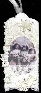 This week on Tag Tuesday, I decided to do a fabric tag, as weddings conjure up lace, and flowers to me. I used pelmet vilene as a base, printed out a picture of the bridesmaids onto fabric, and started layering up the lace with the image. I added some lace flowers to finish off.